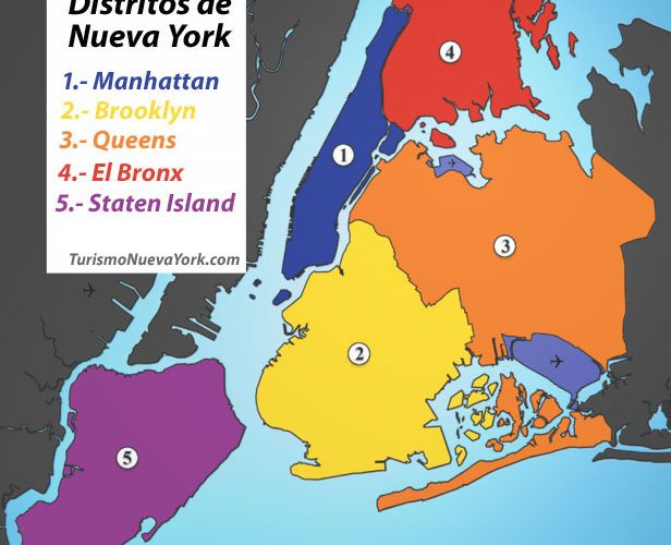 Desde la consolidación de la municipalidad de New York en 1898 la ciudad sigue un singular sistema de división política único en los Estados Unidos de América y característico por poseer administraciones para cada uno de sus cinco distritos municipales, que son responsable de la educación pública, instituciones correccionales, bibliotecas, espacios de ocio, sanidad, seguridad pública, abastecimiento de agua y servicios sociales. Cada distrito, o borough se corresponde históricamente con los cinco condados que constituyen la ciudad y a su vez se dividen en cientos de barrios, muchos de ellos con identidad e historia propia. Sin duda alguna Manhattan, es el borough más conocido e importante de la ciudad. Mide 15 Kilómetros de largo por 3 de ancho y está dividido en tres sectores conocidos como el alto Manhattan o Uptown, la parte Central o Midtown y el bajo Manhattan o Downtown. Con 2,5 millones de habitantes, Brooklyn es el distrito más poblado y diverso de la ciudad y probablemente, después de Manhattan, es el que más carácter tiene ya que fue 4 una ciudad independiente hasta 1898. Sin embargo desde 1883, cuando se inauguró el puente de Brooklyn, este distrito vive a la sombra de Manhattan. Destaca por un patrimonio arquitectónico único y por sus largas playas del sur. Situado enteramente en Long Island, Queens es el borough más extenso de la ciudad, disfruta de la mayor diversidad étnica y es sin duda el que más rápido está evolucionando, hasta tal punto que en pocos años alcanzará un número de habitantes muy similar al de Brooklyn. Por último Staten Island es el distrito más meridional de New York y en general el más desconocido. Debido a sus colinas y relieve complicado y junto a otros factores como el hecho de haber albergado hasta el 2001 el vertedero de basura más grande del mundo, Staten Island es la comunidad menos poblada y con menos carácter de la ciudad. Con algo más de 1.500.000 habitantes es el borough más denso y sobre su escasa superficie se erigen la mayoría de los rascacielos de la ciudad, así como el conocido Central Park. Cuna del rap y el hip hop y situado al norte de Manhattan, el Bronx es el único borough situado sobre el continente. Tiene aproximadamente 1.200.00 habitantes, y posee hermosas playas como Orchard Beach, además del destacable Zoológico del Bronx, el zoológico metropolitano más grande del país cuya población asciende a más de 6.000 animales.