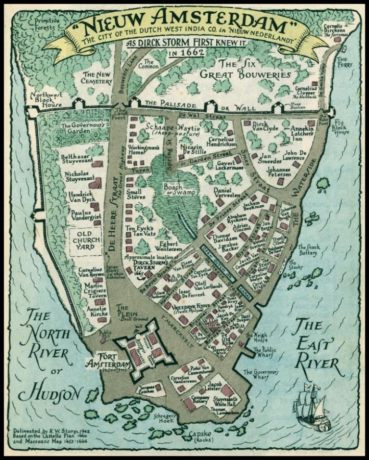La historia escrita de New York es relativamente breve dado que no se dispone de ningún dato hasta el siglo XVI, cuando en 1524 el explorador florentino Giovanni da Verrazzano, al servicio de la corona francesa, entró navegando por el actual estrecho de Narrows y atracó en Staten Island, bautizando la región como Nouvelle Angoulême. La región estaba habitada por alrededor de 5.000 aborígenes de la tribu de los Lenapes que se dedicaban básicamente a la caza, la pesca y algo de agricultura. Casi un siglo más tarde los holandeses comenzaron a explorar la zona y la compañía Dutch East se estableció en Manhattan para crear la primera colonia europea con el nombre de Nieuw Amsterdam en 1625. Peter Minuit, director de la colonia, compró la isla de Manhattan a los Lenape por un equivalente a 24 $ actuales. En este momento la población ascendía a 270 habitantes y sus dirigentes decidieron construir una muralla para protegerse de los ataques indígenas en lo que hoy en día se conoce como Wall Street. 5 Poco más tarde, en 1664, las fuerzas expedicionarias británicas conquistaron la colonia y la rebautizaron con el nombre de New York, en honor al Duque de York. Al finalizar la Segunda Guerra Anglo-Holandesa se firmó el Tratado de Breda que establecía el reparto de las colonias en juego para ambos países. Los holandeses ganaron el control de Surinam, a cambio de que los ingleses controlaran New Amsterdam. Desde entonces New York funcionaría como próspero puerto comercial bajo el Imperio británico hasta que en 1776, se declara la independencia de los Estados Unidos de América, con George Washington a la cabeza, convirtiéndose New York en la capital provisional del país en el año 1785.